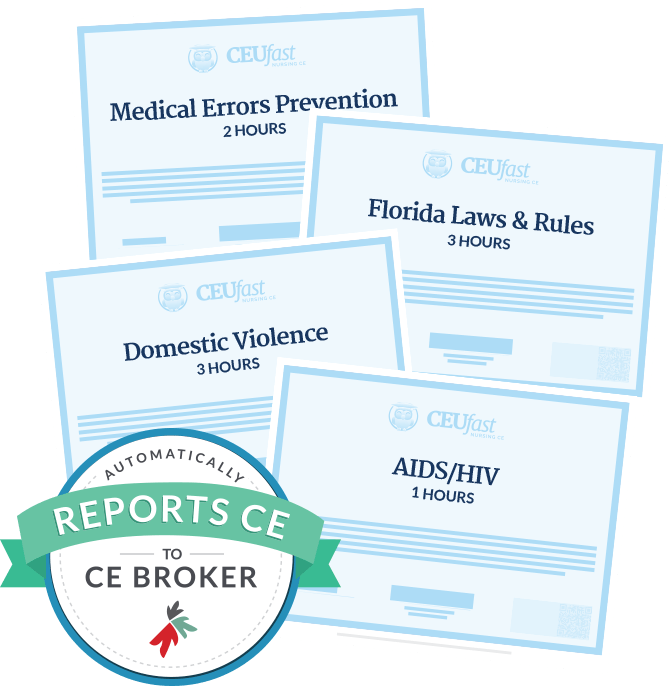 With over 290 peer-reviewed courses, CEUfast is equipped to help Florida nurses meet their specific nursing CE state requirements. The required courses that CEUfast offers include AIDS/HIV One Hour, Current Evidence Based Practice, Domestic Violence, Sexual Violence, Intimate Partner Violence, Human Trafficking, Impairment in the Workplace: Substance Abuse, Laws and Rules: Florida Board of Nursing, and Medical Errors. These courses are designed to fulfill licensure renewal requirements and enhance the quality of care nursing professionals provide.